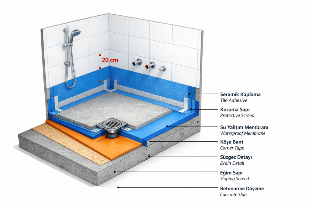 Bu nedenle banyo ve balkonlarda yapılan su yalıtımı sadece yüzeysel bir işlem değil, katmanlı bir yapı sistemi olarak düşünülmelidir.